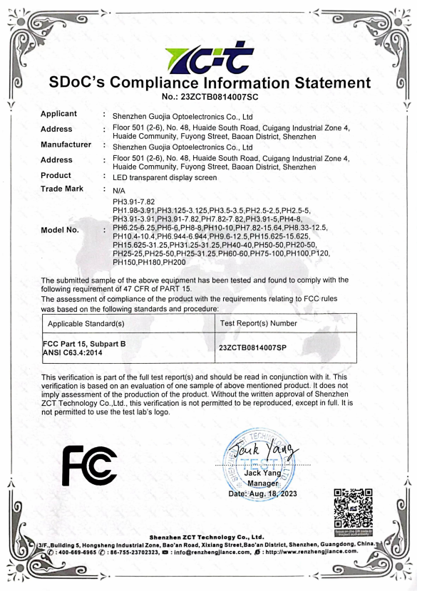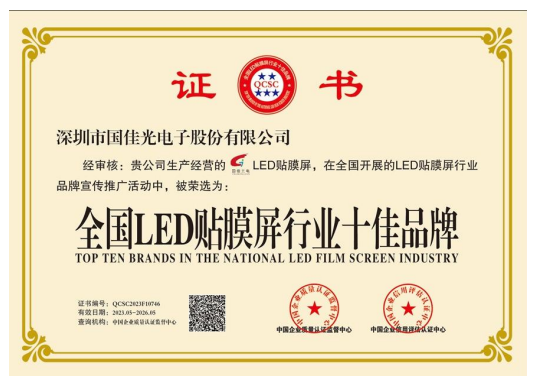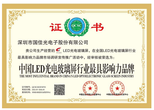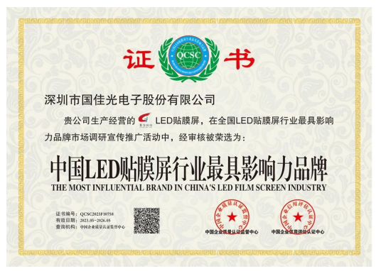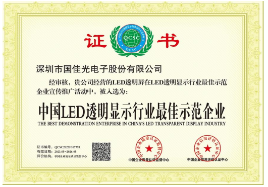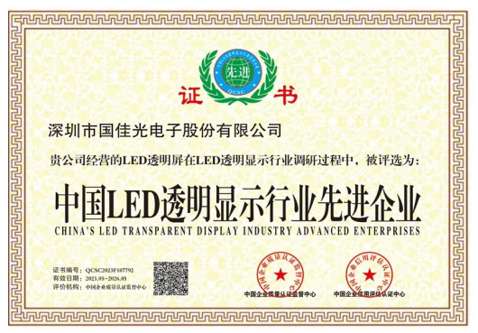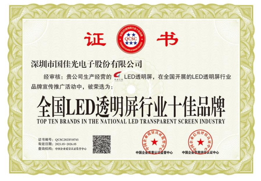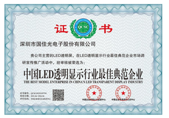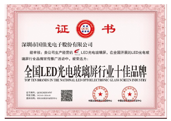 国佳光电注册资金1000万,专注高端LED透明屏17年,是一家制造、研发、设计、销售及工程服务为一体的高新技术企业。公司主营LED光电玻璃,LED智能玻璃屏,LED护栏玻璃屏,LED贴膜屏,LED透明屏,LED晶膜屏幕,LED格栅屏幕,LED户外透明屏,LED全息透明屏,LED隐形屏,大型LED时光隧道等应用产品。公司拥有专业生产设备与过硬的技术,行内资深、高素质、高标准的现代化管理队伍,高水平的专业技术开发人员,拥有数百名具备多年操作经验和训练有素的员工。公司严格执行7S管理标准和行业管理标准,先后通过ISO9001-2000/3C/CE/FCC/ROHS等质量体系认证,可靠的质量、先进的技术、完美的工艺、全自动化的配套生产设备、标准流水线生产,完善的销售网络和 良好的售前售后服务 是我们提供高质量产品和不断发展的根本。