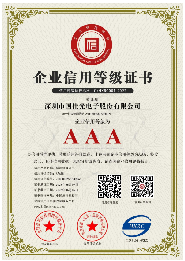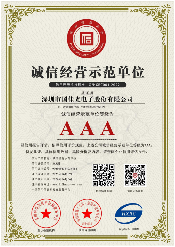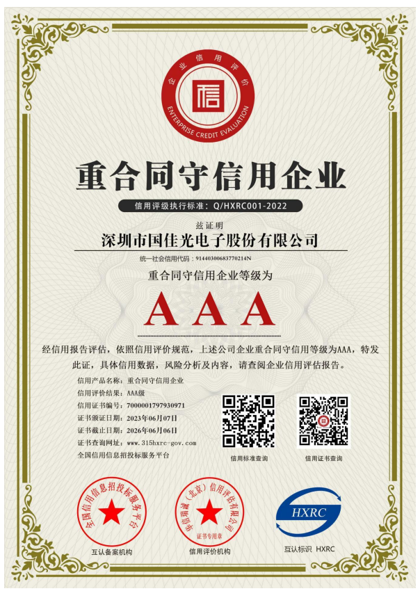 国佳的愿景是建设成为一个具有行业地位、受人尊敬的大公司。面向未来,国佳光电续秉持“创造价值、追求卓越”的核心理念,努力恪守企业公民的社会责任,致力于创新发展、和谐发展、绿色发展,矢志打造长青基业,持续为利益相关方及社会大众创造福祉,我们不断的在努力,您的支持非常重要。