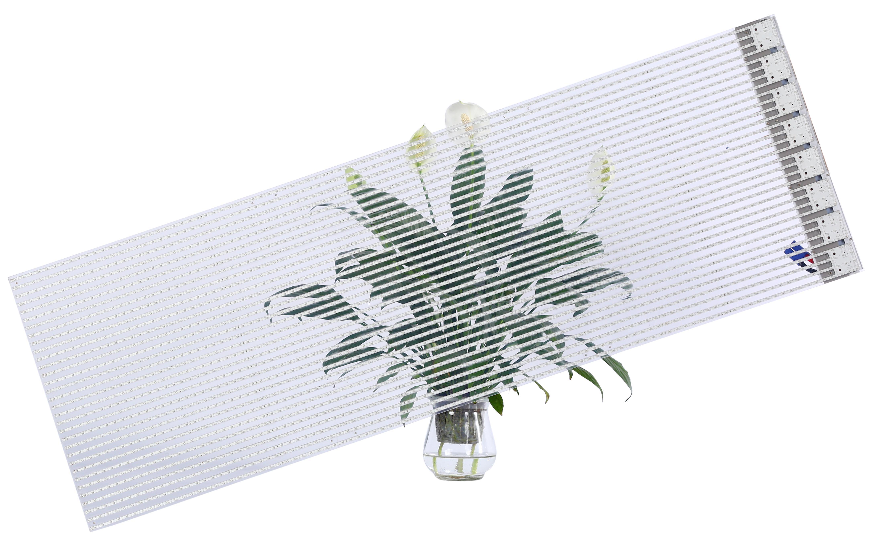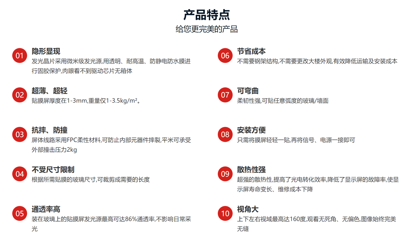 轻(3KG/㎡)、薄(3-6mm)、透明,任意裁剪,百搭造型,美观大气,安装简单是国佳贴膜屏的最大趋势,国佳研发出的贴膜屏,致力于满足全球LED贴膜屏的需求,采用我司特定芯片,将元器件固装在高透的PCB板材上,通过特有的盖胶工艺,使显示模块整合成一款高透可发光显示的光学透镜式基板。