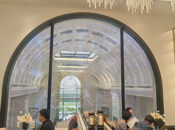 LED全息网格隐形屏具有许多显著的优势。首先,它的透明度高,无结构龙骨架的设计使得直视感观通透率高达90%以上,人们在欣赏显示内容的同时,几乎感觉不到屏幕的存在。其次,它轻盈美观,屏体重量轻、厚度薄,可以完美贴合在透明玻璃上,与建筑结构融为一体,不破坏原有建筑的美感。此外,它的模组设计巧妙,可弯曲、可裁剪,能够适应各种不同形状和大小的显示需求。