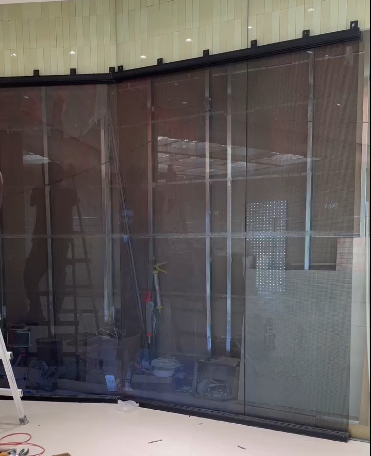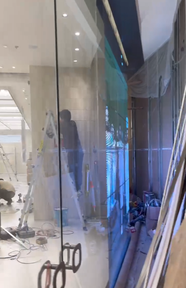 由于现场正面施工围挡装饰没有拆除,所以正面画面无法拍摄,现场效果非常震撼,高清,高透,完全不影响店内的采光