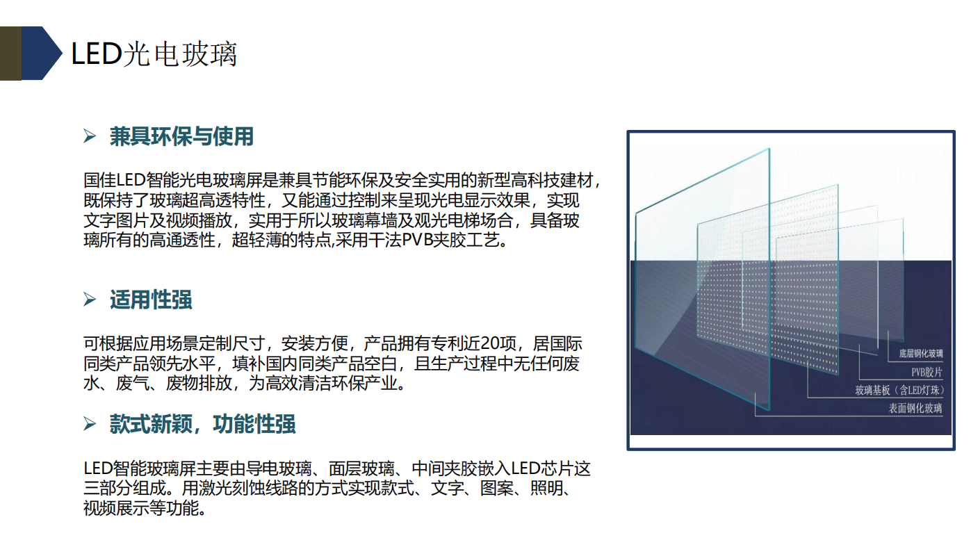 LED智能玻璃主要由ITO导电玻璃、面层玻璃、中间灌胶嵌入LED芯片三部分组成。用激光刻蚀线路的方式实现款式、文字、图案、照明、视频展示等功能。LED智能玻璃可达到99.7%相对透明度,可见光透过率≥80%,采用一站式完整的安装方式,保证了清晰的视野。LED智能玻璃是兼具节能环保及安全实用的新型高科技建材,既保持了玻璃超高透特性,又能通过控制来呈现光电显示效果,可为多领域提供解决方案。随着建筑媒体的发展,LED智能玻璃应用的范围会越来越广。LED智能玻璃广泛用于室外玻璃幕墙、室内外装饰、照明设计、户外媒体等领域。作为新型的媒体建材,完美实现了视频播放与建筑物相结合,在达到高透光度的同时,也实现了传媒价值,是媒体建筑发展的革命性趋势。产品间距最小做到G10 一般使用G12 G16 G20 G25 G30 G40 G50较多。