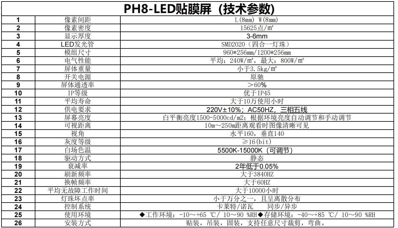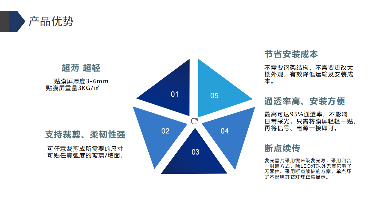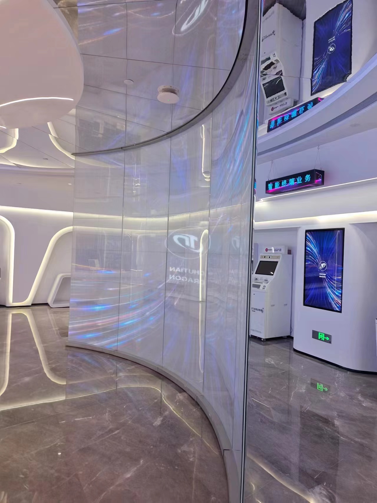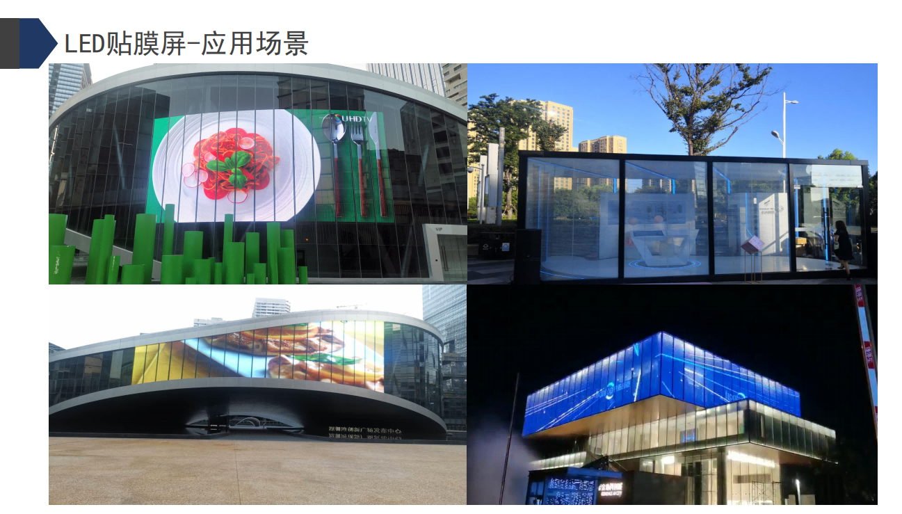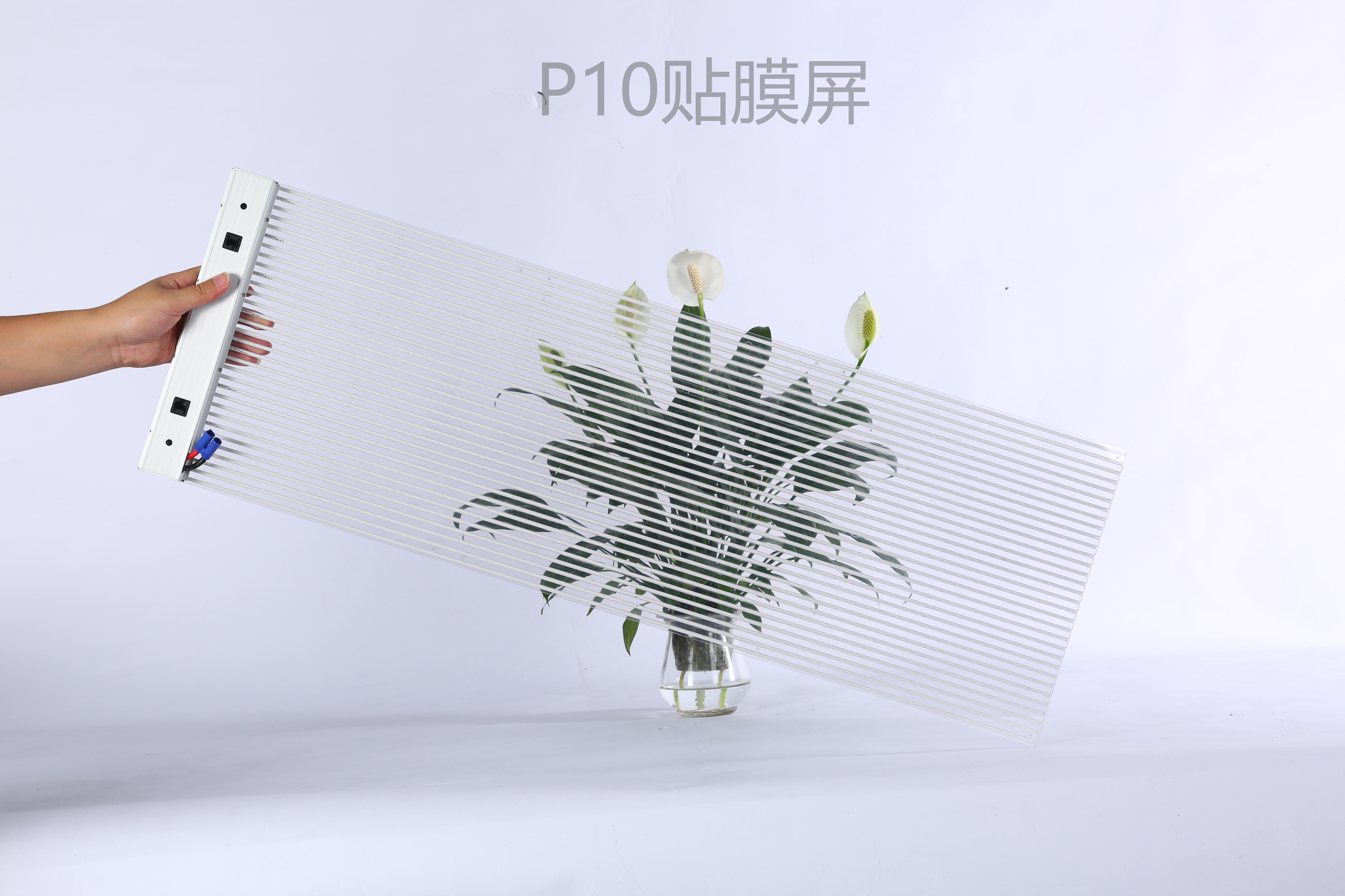 国佳光电贴膜屏是一款打破常规LED显示屏的高端产品。轻、薄、透明、安装简单是显示屏的大趋势,国佳光电研发出品的贴膜屏,致力于满足全球LED贴膜的需求,采用我司特定裸芯片,将元器件固装在高透的PCB板材上,通过特有的盖胶工艺,使显示模块整合成一款厚度最小是1~3mm的高透可发光显示的高透光学透镜式基板。广泛应用于展厅,橱窗,玻璃幕墙,护栏,把原有的玻璃秒变显示屏,只需要一撕一贴即可,安装方便,无需技术人员即可以安装,可以任意弯曲,适用更多的复杂造型,可以随意裁剪,尺寸不受限制。