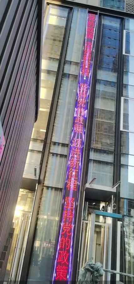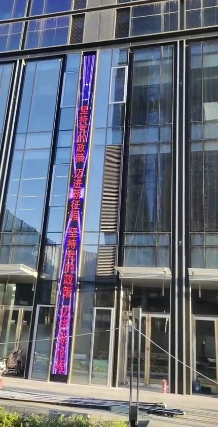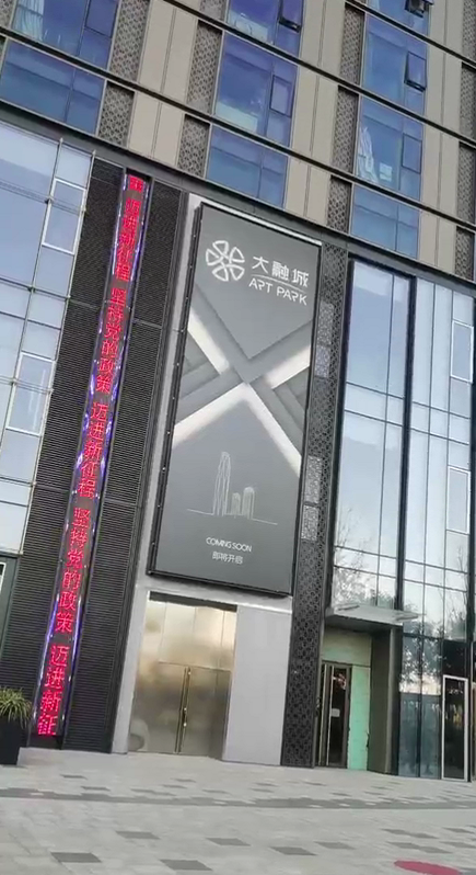 新光大中心由一座主塔--"北京塔"及六座错落有致的高层建筑组成,其业态包含已经建成的4栋商务公寓之外,还包括3栋国际甲级写字楼建筑群。整个项目建筑群体形成了众星捧月的姿态,以"北京塔"为中心,其他楼座采用灵动的点式布局坐拥在主塔周围,保证了各楼栋采光及观景效果。采用本公司P8户外透明屏为建筑外立面添彩,4块长条屏面积共100平方,主要以炫彩动态及党建标语作为播放素材。
