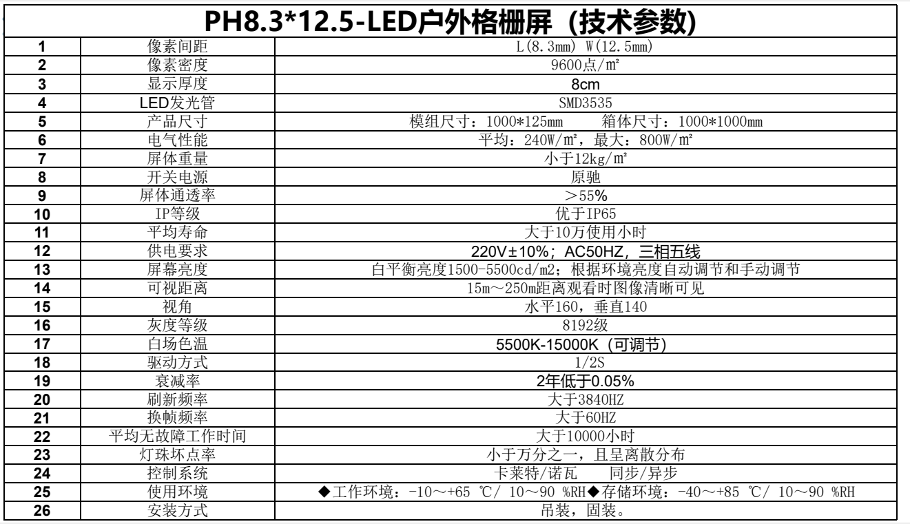格栅屏是一种以灯条组成格栅状的LED显示屏,也称之为灯条屏。因其结构是镂空式,网格式,因此业内人士又把它叫做网格屏,镂空屏等。格栅屏主要应用于建筑墙体,玻璃幕墙外,建筑顶部,还包括户外高炮,观光电梯等场景。主要防水性能高。国佳格栅屏格栅屏优点万级亮度(13000CD),低功耗(最大300W),性价比高