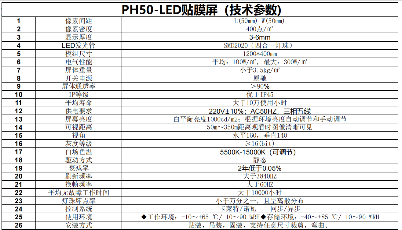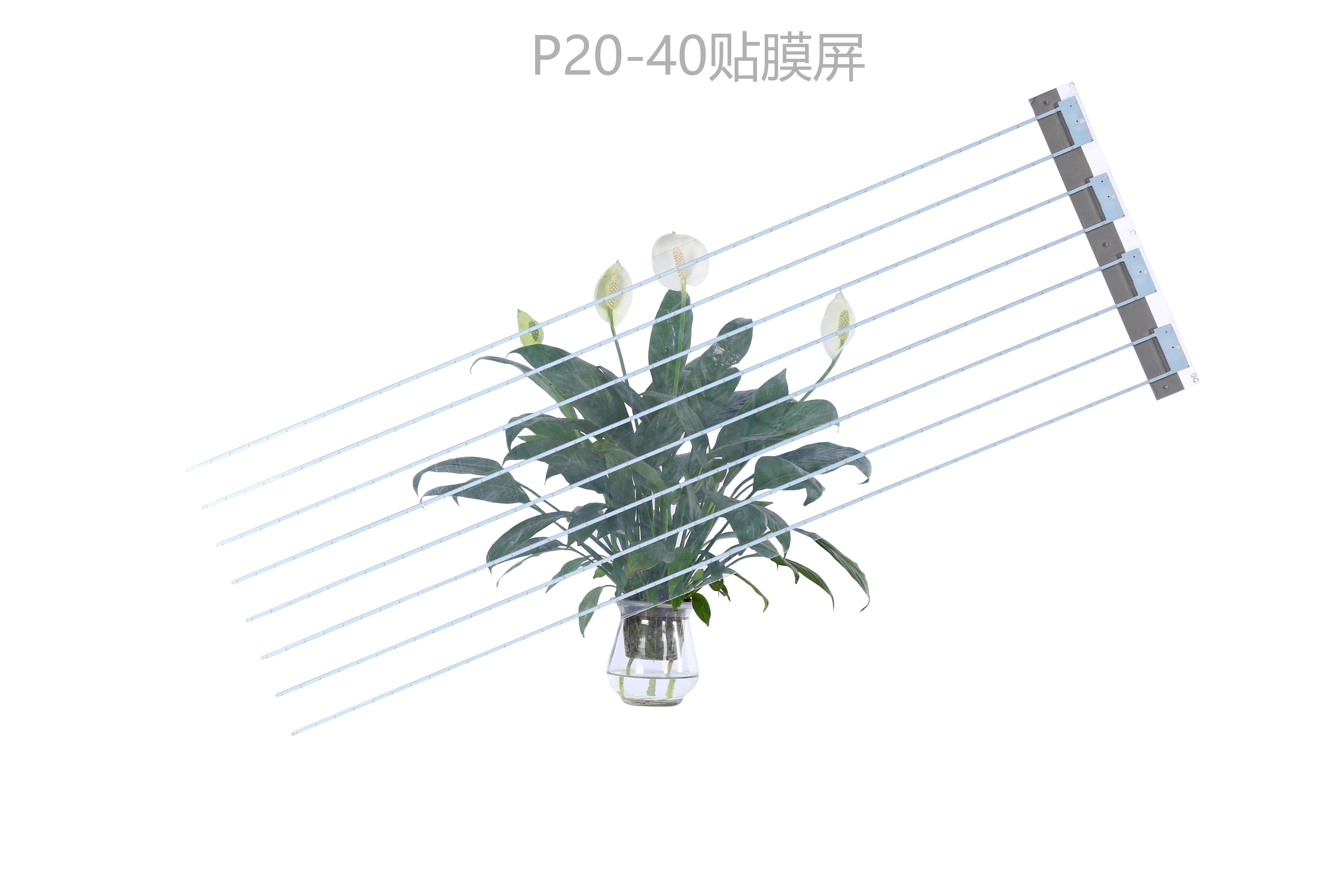 Led贴膜屏,也称为Led玻璃屏幕。采用特定裸芯片,将Led灯固装在高透的pcb板材上,通过特有的盖胶工艺,使显示模块整合成高透光学透镜式基板。传统LED显示屏:固定呆板的显示,笨重、不易维护、散热差。使用成本高、施工周期长、存在安全隐患、影响建筑美观、采光差、较难通过监管审批。效果具有很高的穿透率,透明度为70%-95%。不会影响室内外采光,不会对原始的设计产生影响。可直接贴在玻璃幕墙上,或采取角码固定,无需安装支架,无需改变建筑结构。支持任意裁剪,不影响显示效果。LED贴膜屏可直接贴在玻璃幕墙上,从外观上看与建筑物融为一体。柔韧性强,可弯曲,可贴有弧度的建筑幕墙,能满足不同场地的设计需求。观看无死角、无偏色,图像始终完美无缝,具有很好的广告效果和艺术效果。较强的散热性,提高了光电转化效率,降低了显示屏的故障率,使显示屏寿命变长、维修成本下降。不需要传统的制冷系统和空调散热,比普通的led显示屏节能30%以上。led显示屏的规格有很多,且支持定制。其价格以型号为参考,型号越小,则价格越高。Led贴膜屏的安装,不需要额外的钢结构、不破坏原有的装修设计,只需要贴合在玻璃上,就可以进行快速安装。