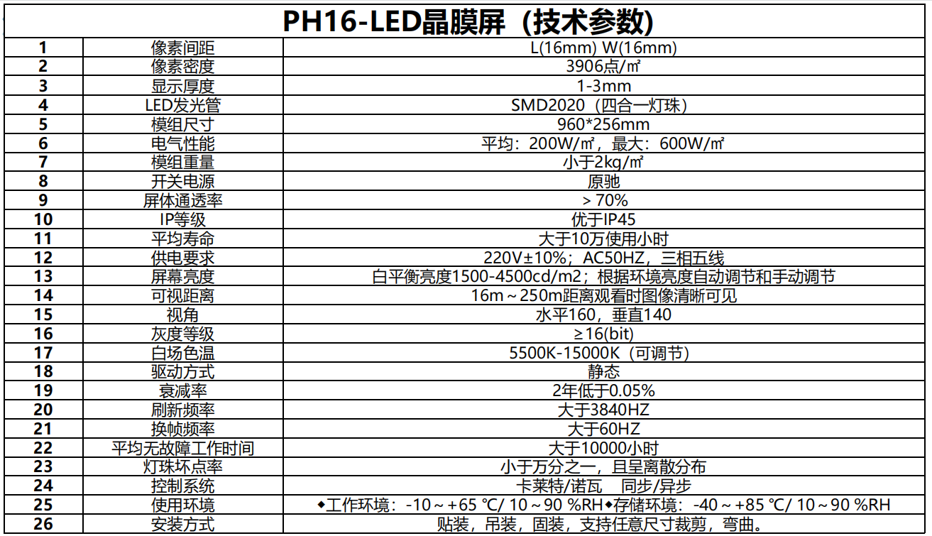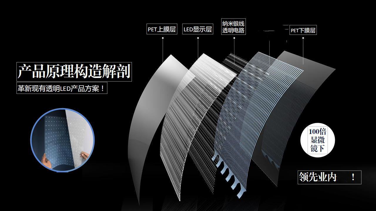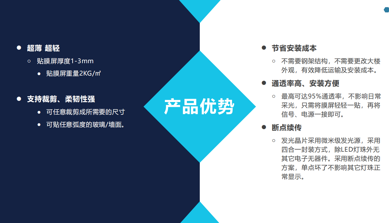 LED晶膜屏是一款打破常规LED透明屏产品。采用特定裸芯片,将元器件固装在高透的柔性薄膜上,通过特有的盖胶工艺,使显示模块整合成可发光显示的高透光学透镜式基板。具有轻薄、透明、灵活轻便、安装简单的特点。产品应用于幕墙、展厅、橱窗、观光电梯、商场护栏等玻璃领域,安装方便,直接粘贴于玻璃上面,正面背面都可以贴,产品可以现场直接用美工刀裁剪,可以360度任意弯曲,透明度高大99%,售后简单,屏体本身采用灯区一体,自主研发,高可靠性,行业领先,断点续传,除了灯看不到其他的电子元器件,单边最长1.5米,上下拼接3米,长度无限制。高灰阶显示(真16bit) RGB通路采用32级电流线性调节,而且在任何电流下均保持16bit灰度显示,适用于户内、半户外、户外各种电流要求的一致性;自研灌胶工艺(屏体自带粘性可直接贴附于玻璃表面,胶体吸附力强,因胶体本身固有特性随着时间的推移粘性也会增强)