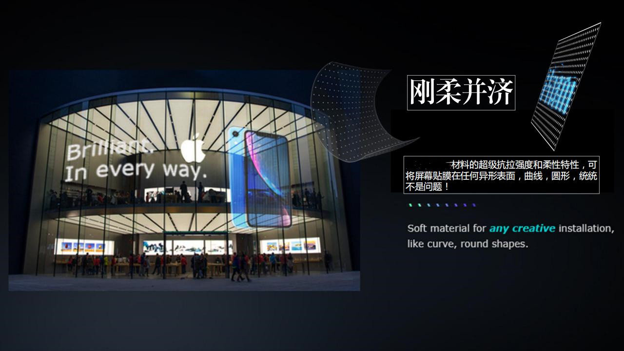 LED晶膜屏是一款打破常规LED透明屏产品。采用特定裸芯片,将元器件固装在高透的柔性薄膜上,通过特有的盖胶工艺,使显示模块整合成可发光显示的高透光学透镜式基板。具有轻薄、透明、灵活轻便、安装简单的特点。产品应用于幕墙、展厅橱窗、观光电梯、商场护栏等玻璃领域,安装方便,直接粘贴于玻璃上面,正面背面都可以贴,产品可以现场直接用美工刀裁剪,可以360度任意弯曲,透明度高大99%,售后简单,屏体本身采用灯区一体除了灯看不到其他的电子元器件,单边最长1.5米,上下拼接3米,长度无限制。