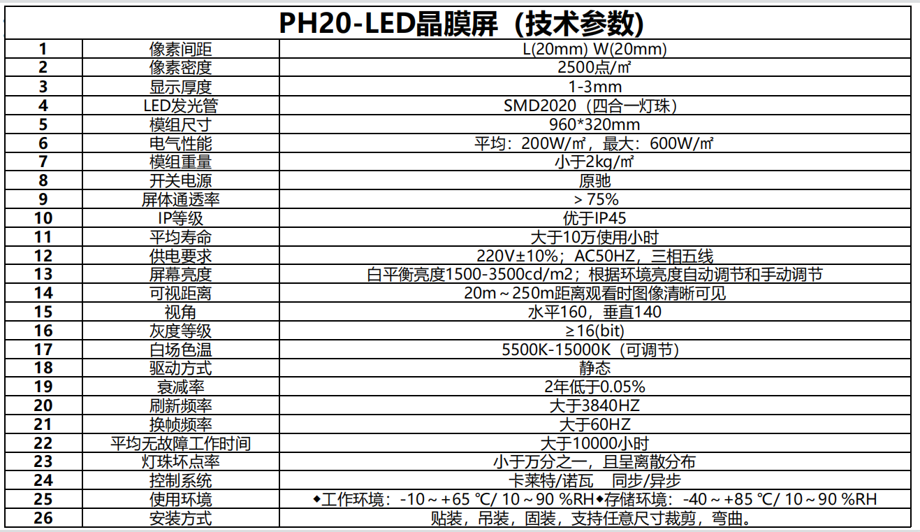 LED晶膜屏是一款打破常规LED透明屏产品。采用特定裸芯片,将元器件固装在高透的柔性薄膜上,通过特有的盖胶工艺,使显示模块整合成可发光显示的高透光学透镜式基板。具有轻薄、透明、灵活轻便、安装简单的特点。产品应用于幕墙、展厅、橱窗、观光电梯、商场护栏等玻璃领域,安装方便,直接粘贴于玻璃上面,正面背面都可以贴,产品可以现场直接用美工刀裁剪,可以360度任意弯曲,透明度高大99%,售后简单,屏体本身采用灯区一体,自主研发,高可靠性,行业领先,断点续传,除了灯看不到其他的电子元器件,单边最长1.5米,上下拼接3米,长度无限制。高灰阶显示(真16bit) RGB通路采用32级电流线性调节,而且在任何电流下均保持16bit灰度显示,适用于户内、半户外、户外各种电流要求的一致性;自研灌胶工艺(屏体自带粘性可直接贴附于玻璃表面,胶体吸附力强,因胶体本身固有特性随着时间的推移粘性也会增强)